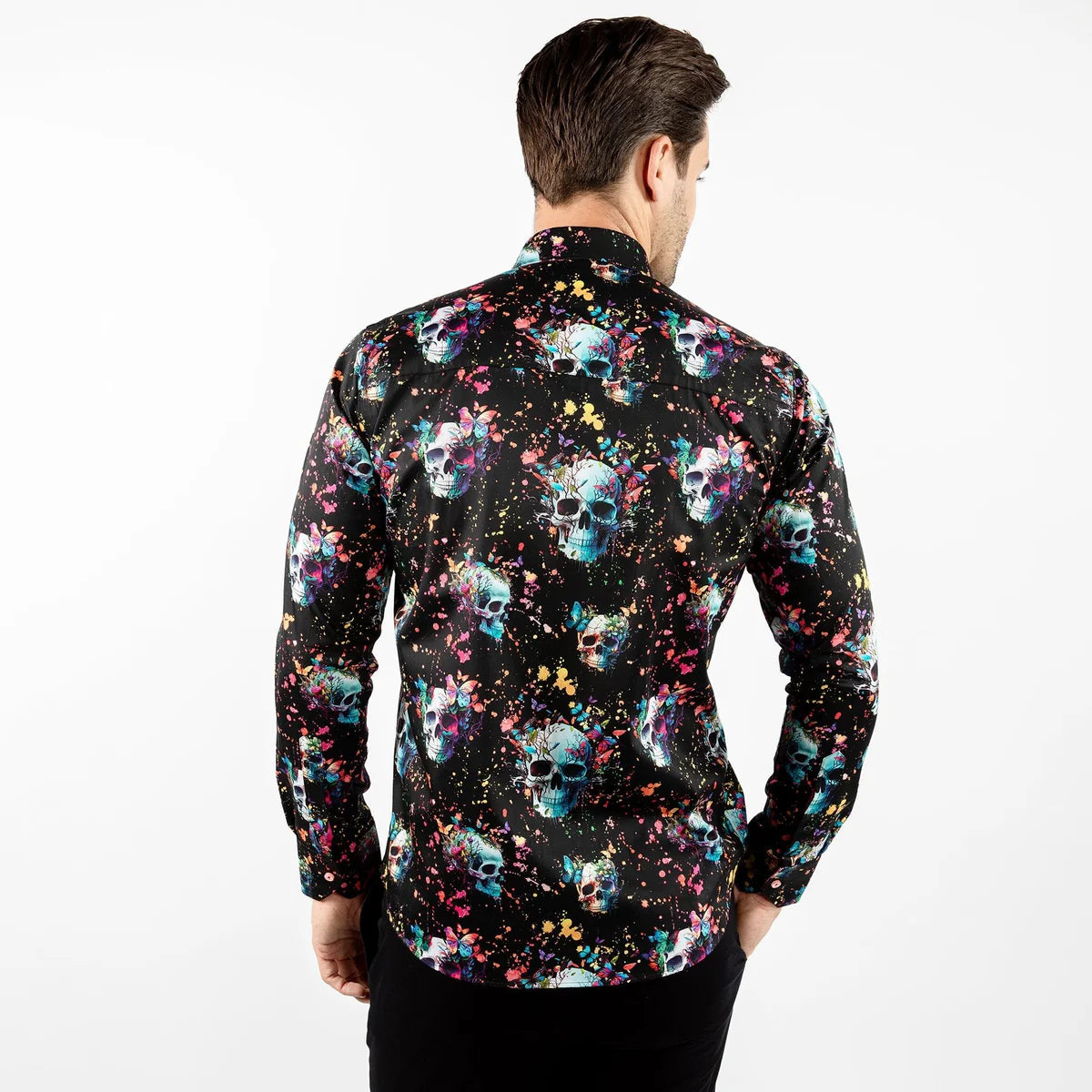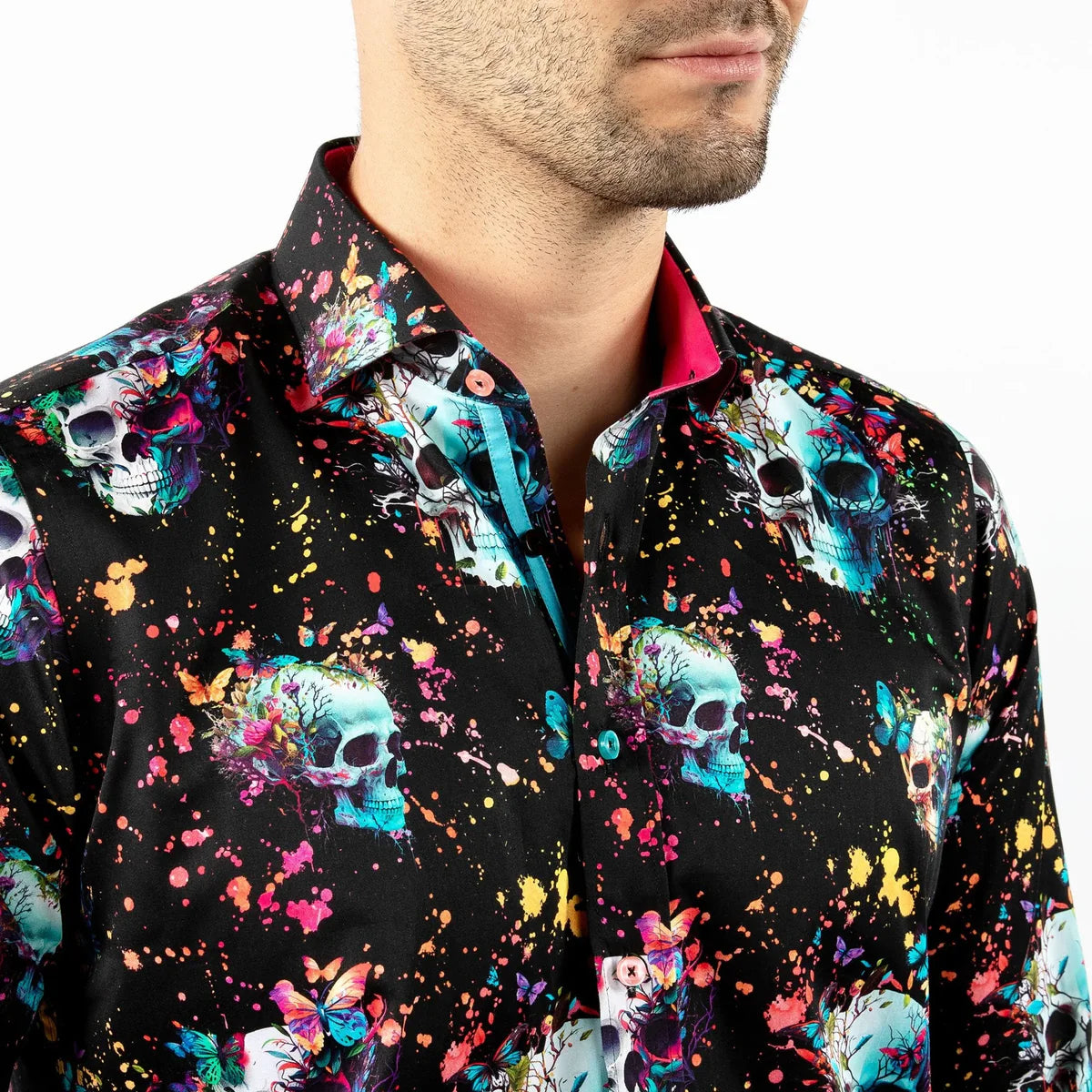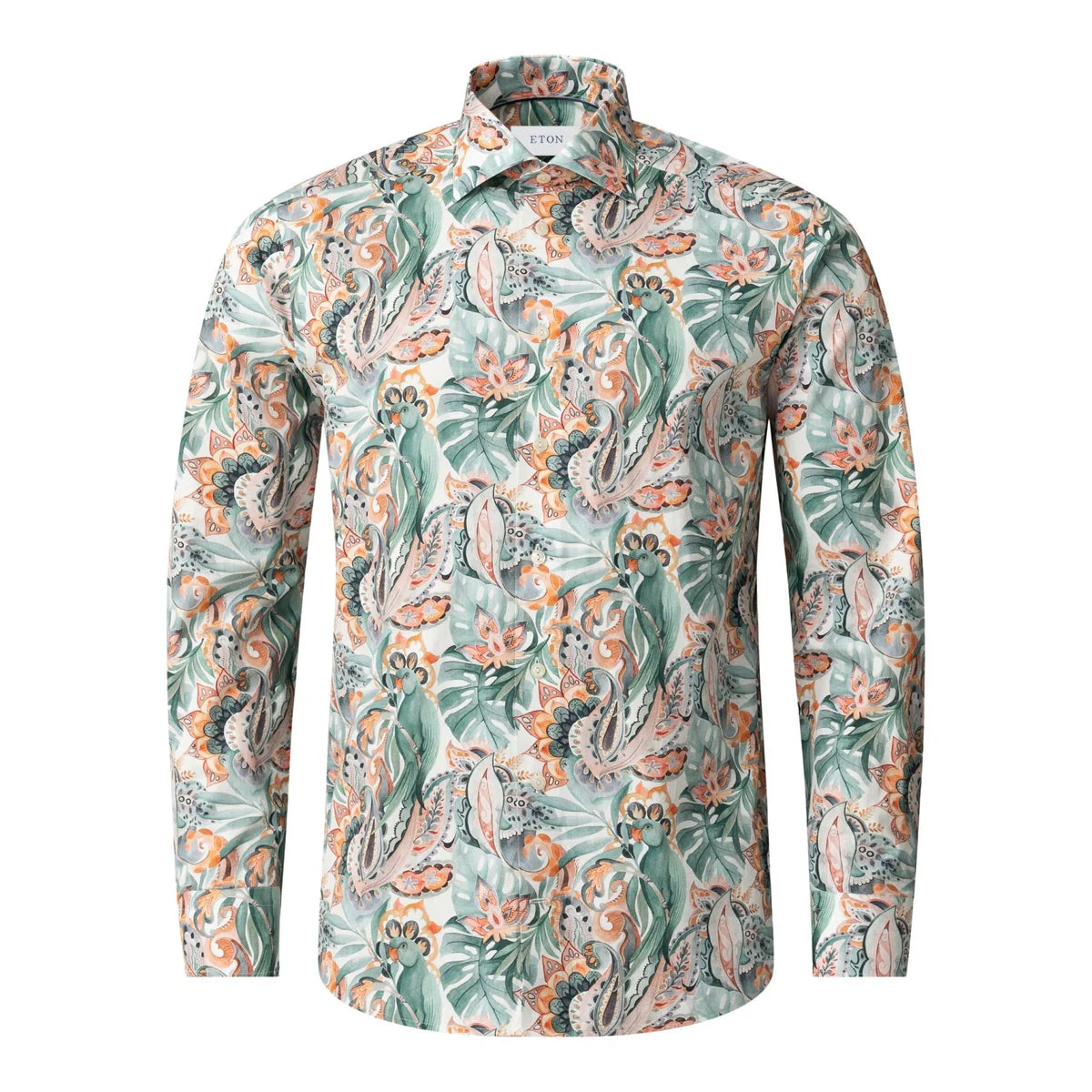 This premium long sleeve shirt from Claudio Lugli features a captivating Mushroom Print. The construction is 100% Satin Cotton, complete with a concealed under-collar button. Additionally, there is a single collar button, contrast lining and piping on the placket, all with adjustable cuffs and buttons.