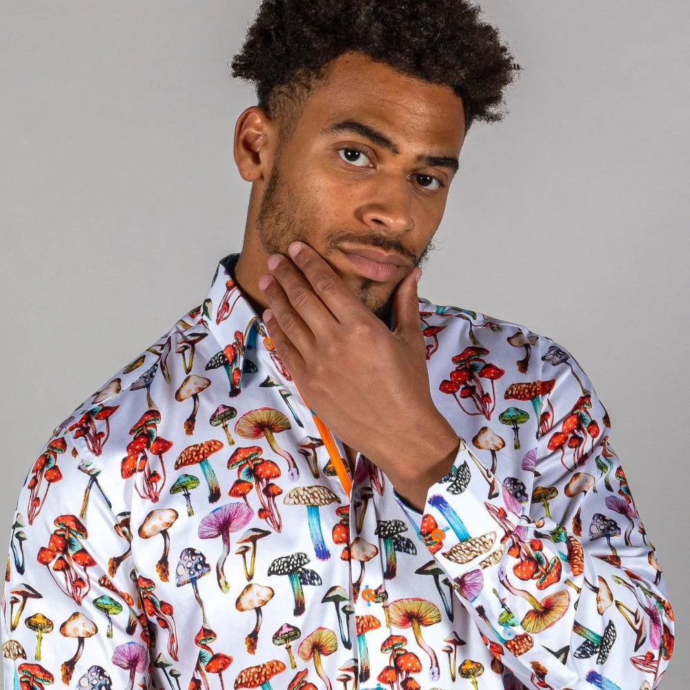 This premium long sleeve shirt from Claudio Lugli features a captivating Mushroom Print. The construction is 100% Satin Cotton, complete with a concealed under-collar button. Additionally, there is a single collar button, contrast lining and piping on the placket, all with adjustable cuffs and buttons.